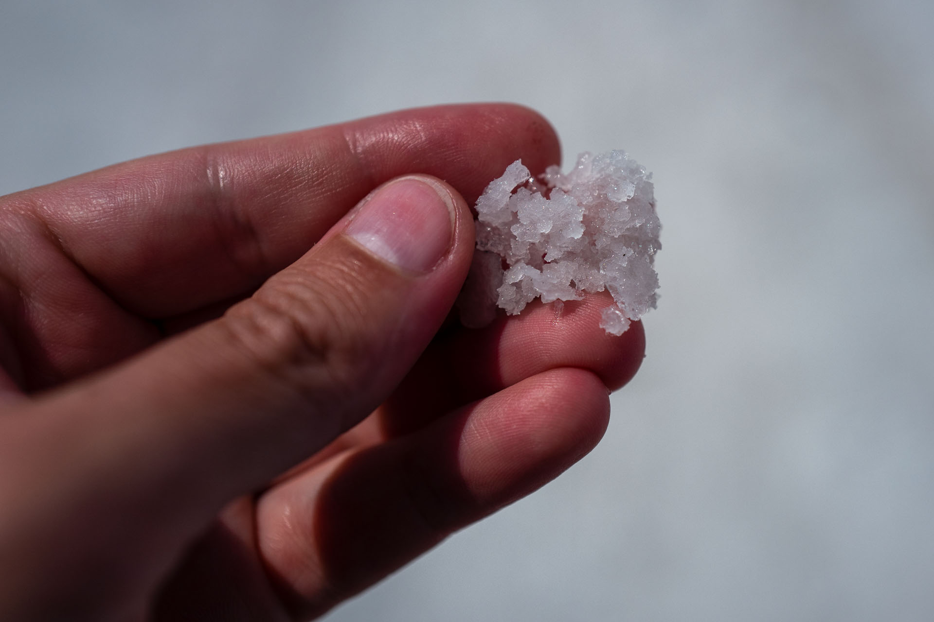 Wenige Kilometer weiter kommt dann ein größerer Rastplatz, von dem man direkten Zugang zu den Salzflächen hat. So weit man schauen kann, ist die Erde mit einer dicken Salzkruste bedeckt. Dazu ist es extrem hell und ohne Sonnenbrille nicht zu ertragen. Natürlich müssen auch wir mit dem Auto ein Runde auf der Salzfläche drehen. Die Salzkruste ist an der Stelle so hart, dass man tatsichlich kaum Spuren mit dem Auto auf ihr hinterlässt.